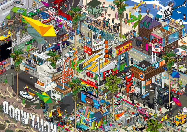 Un jueguecito de esos que me encantan. Localizar cosas y personajes en una imagen de eBoy, al que adoro. Su póster de Tokyo domina toda una pared de mi habitación, y ya puse en el blog la imagen de Nueva York. Pero hoy toca una curiosa ilustración de Los Ángeles, cuna de lo peor y lo mejor de Estados Unidos.
